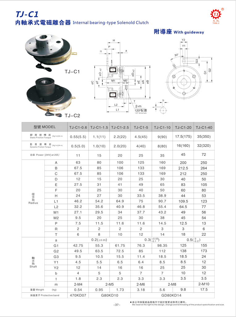 DC24V干式单片电磁离合器型号选型参数表如下: