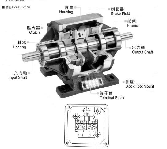 其之电枢与电磁刹车器则在同轴而形成的出力轴,电磁离合器之轭与电磁刹车器装置于机架上。