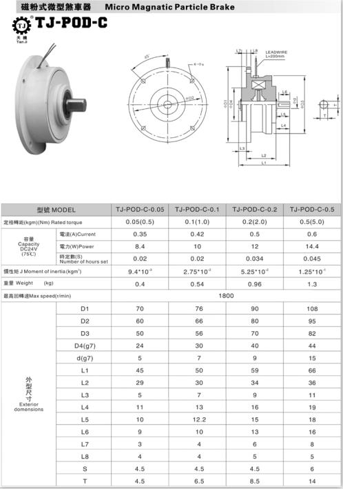 注:以上为东莞天机传动微型磁粉制动器系列型号中的“KG”代表“Nm”即1KG≈1Nm,额定电压为DC24V,最高转速为1800r/min。