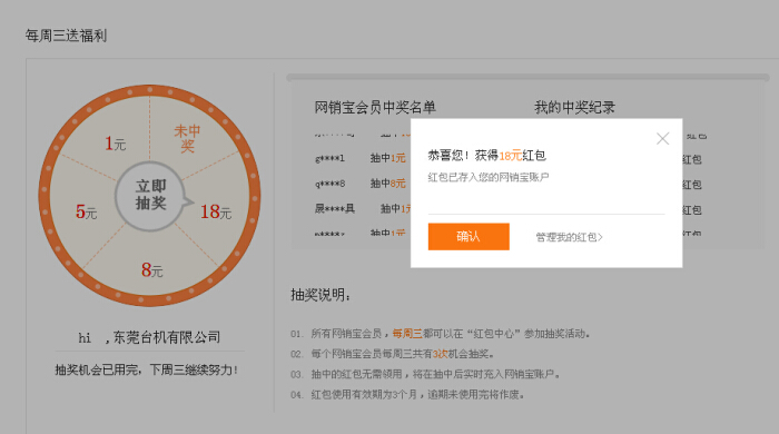 每周星期三都会有付费推广费用的抽奖活动,